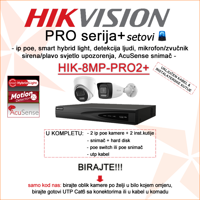 HIK-8MP-PRO2+ IP PoE komplet za video nadzor uključuje 2 Smart Hybrid Light 4K kamere, AcuSense video snimač sa PRO hard diskom, baze za kamere, kablove.